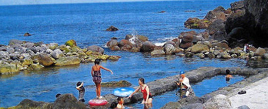 潮の干満と波浪。 岩で囲った湯船が波をかぶれば海になる。