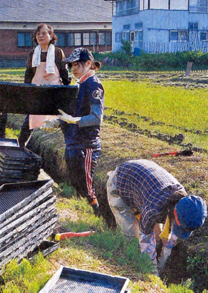 稲の苗穂の土を洗う大学生