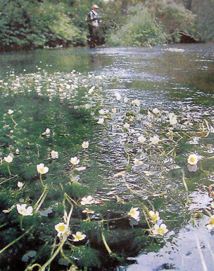 釣り人たちがさっそくバイカモの脇を狙ってさおを振っていた。