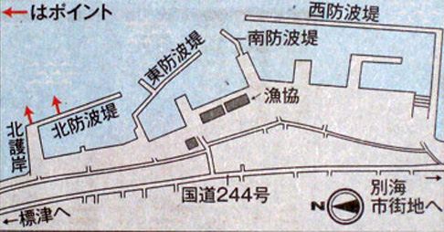 6月7日正午ごろ、人気ポイントの北防波堤の基部から中間部にかけての