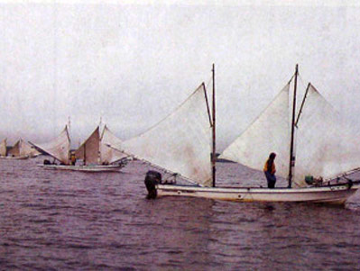 帆で風を受けて網を引く明治時代から続く伝統的な漁。