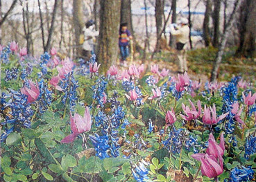 約32㌶の園内は紫と青で彩られ、ところどころに顔を出した白いイチゲや