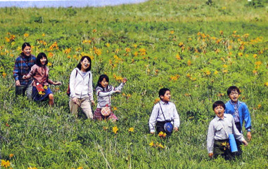 エゾカンゾウが咲き乱れる利尻島の草原で、吉永と6人の子役が歌いながら歩くシーン。