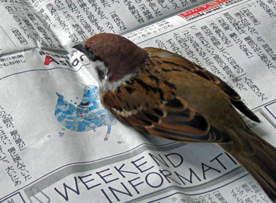 新聞の上で遊ぶ、スズメのチビ。